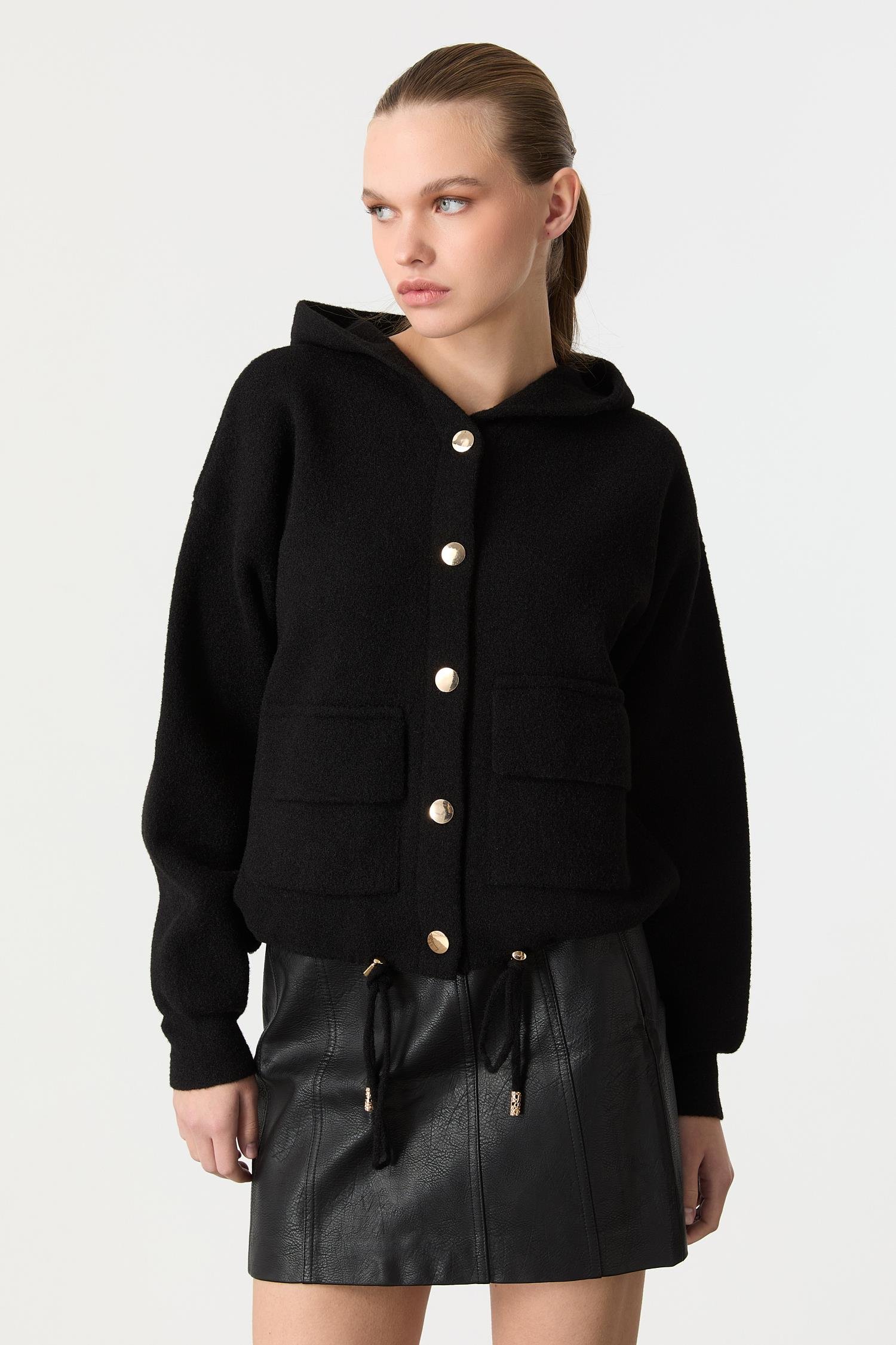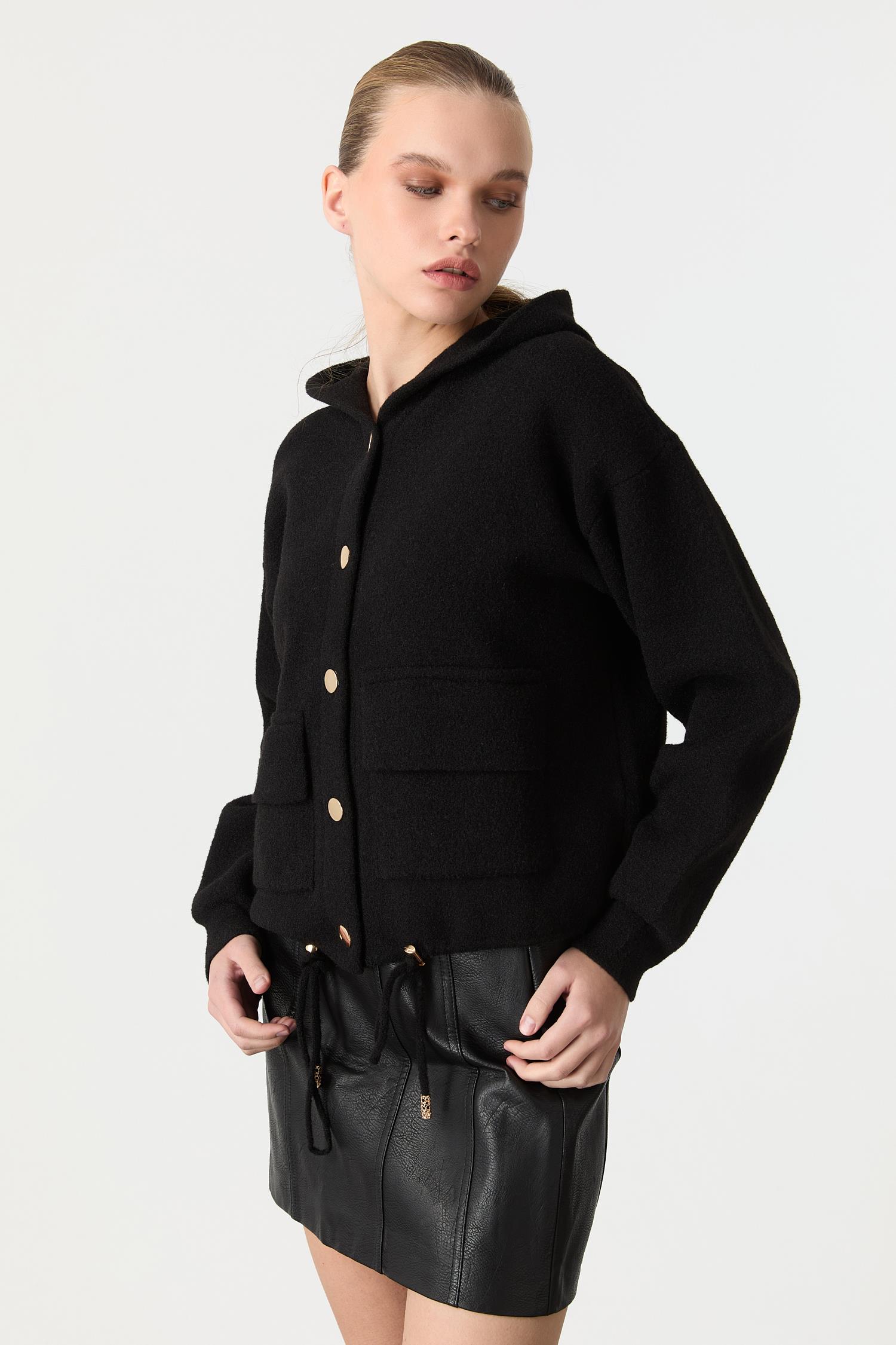 Kapüşon Detaylı Peluş Hırka-SİYAH (5WERN005255_01)