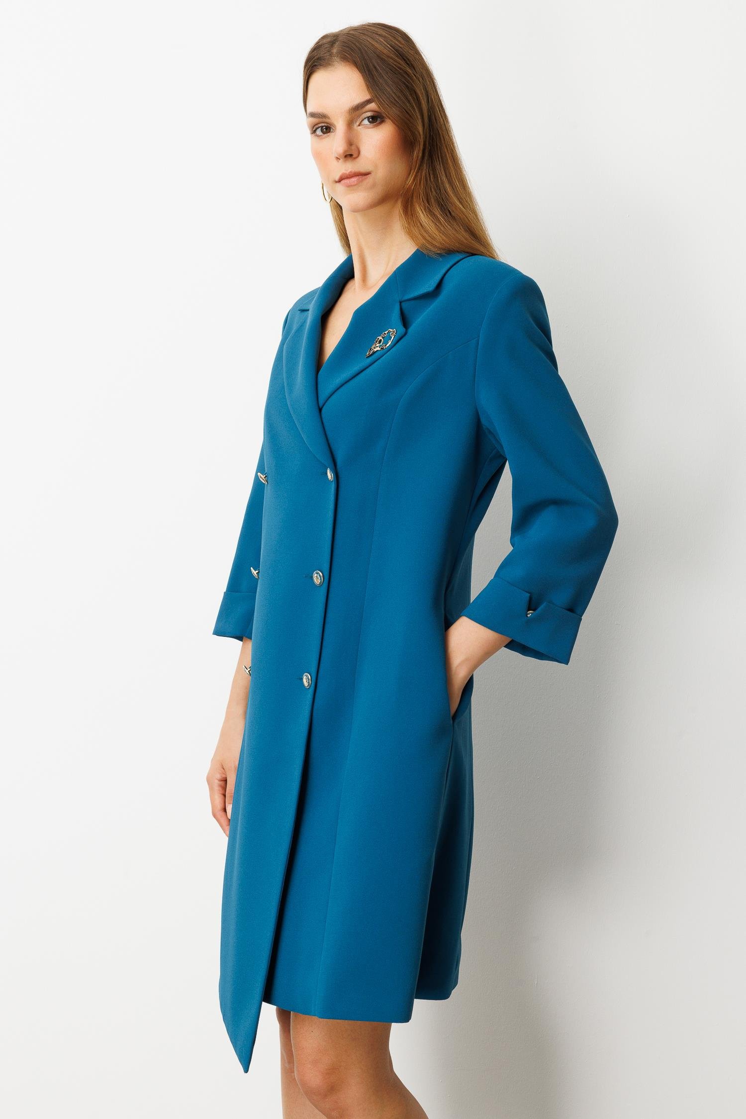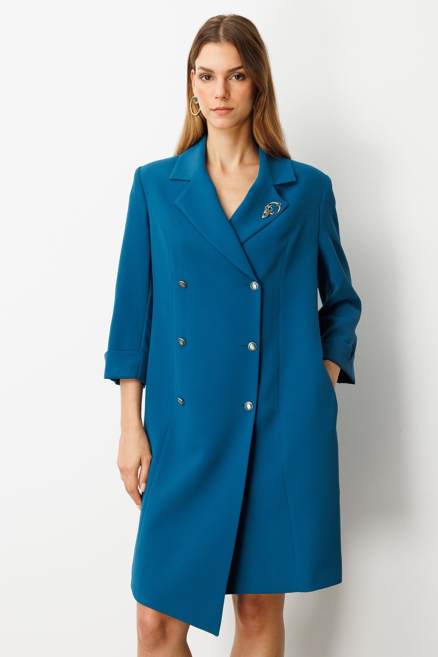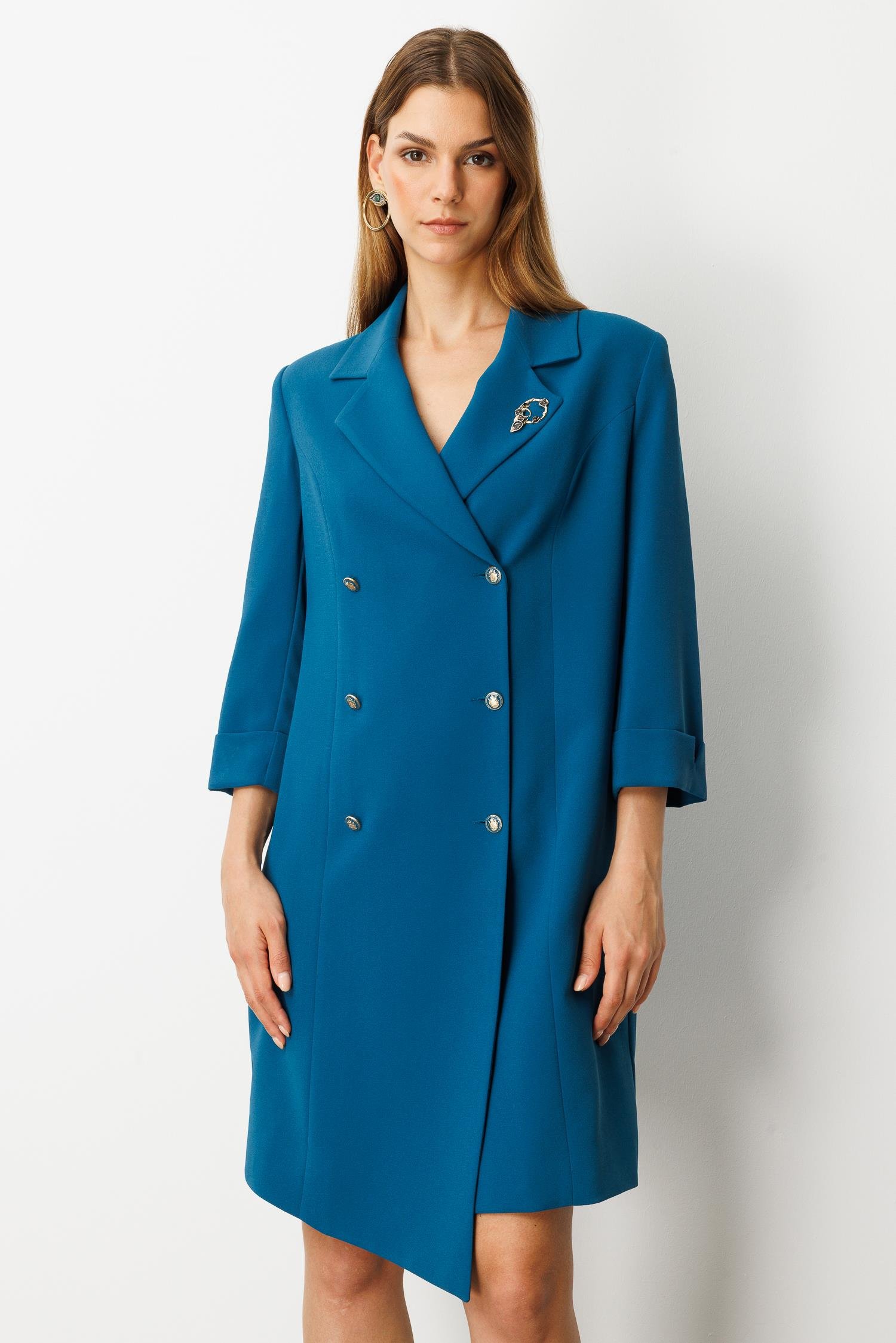 Kruvaze Yaka Düğmeli Ceket Elbise-SİYAH-PETROL (5WKB41K1516_56)