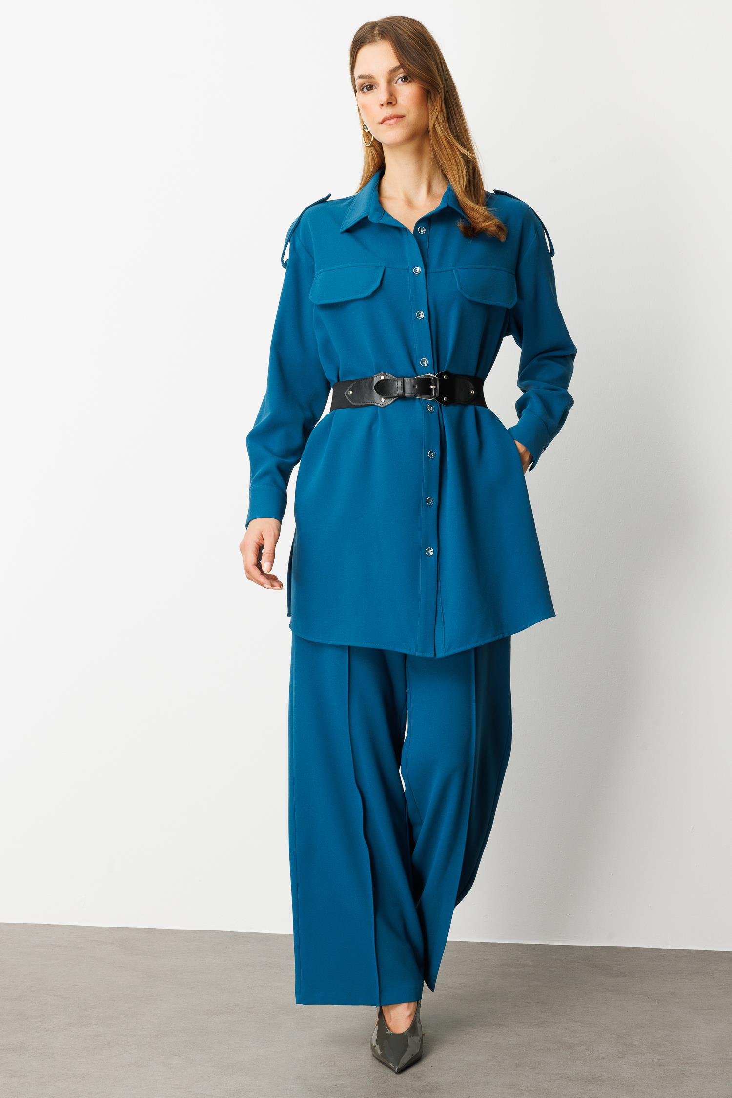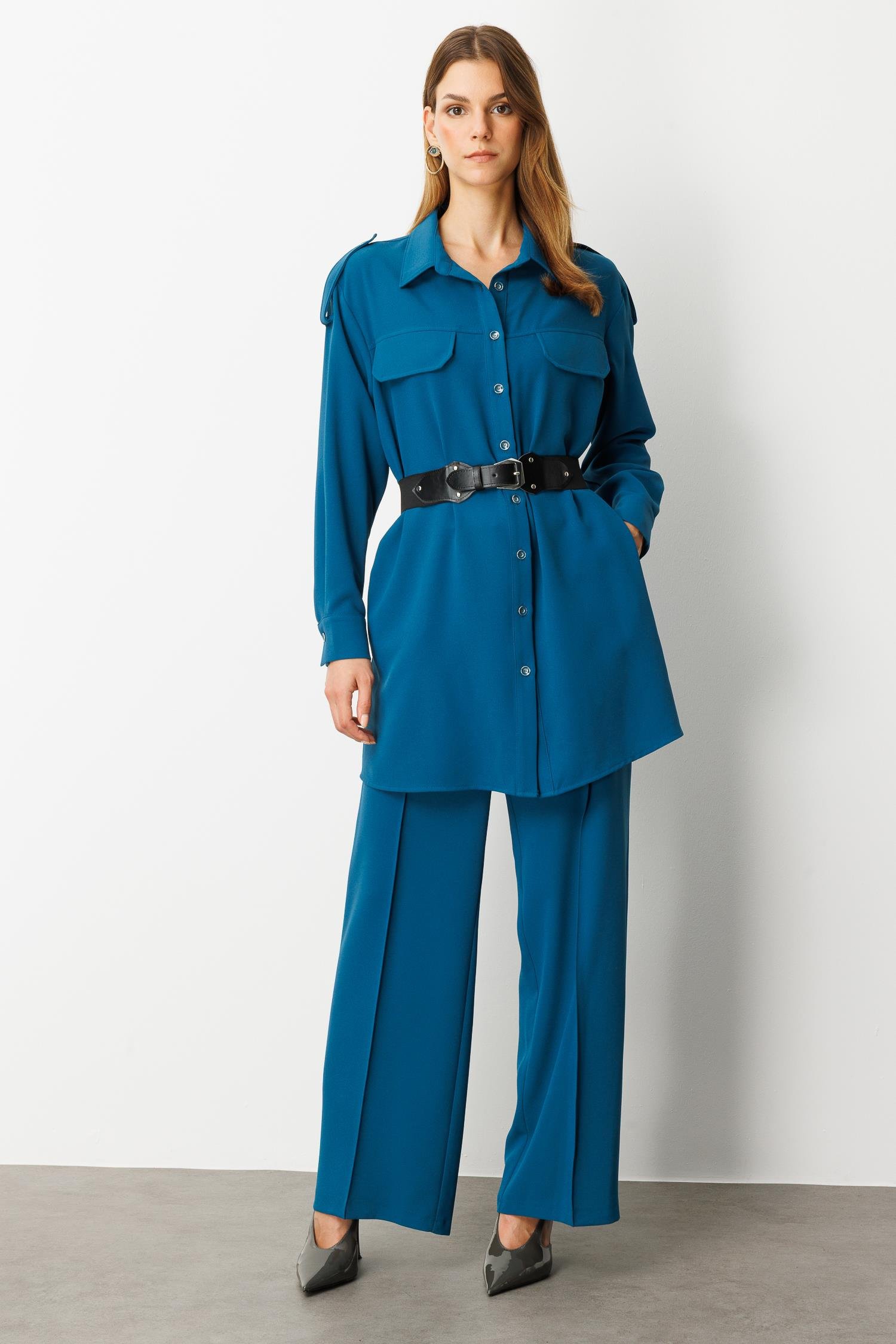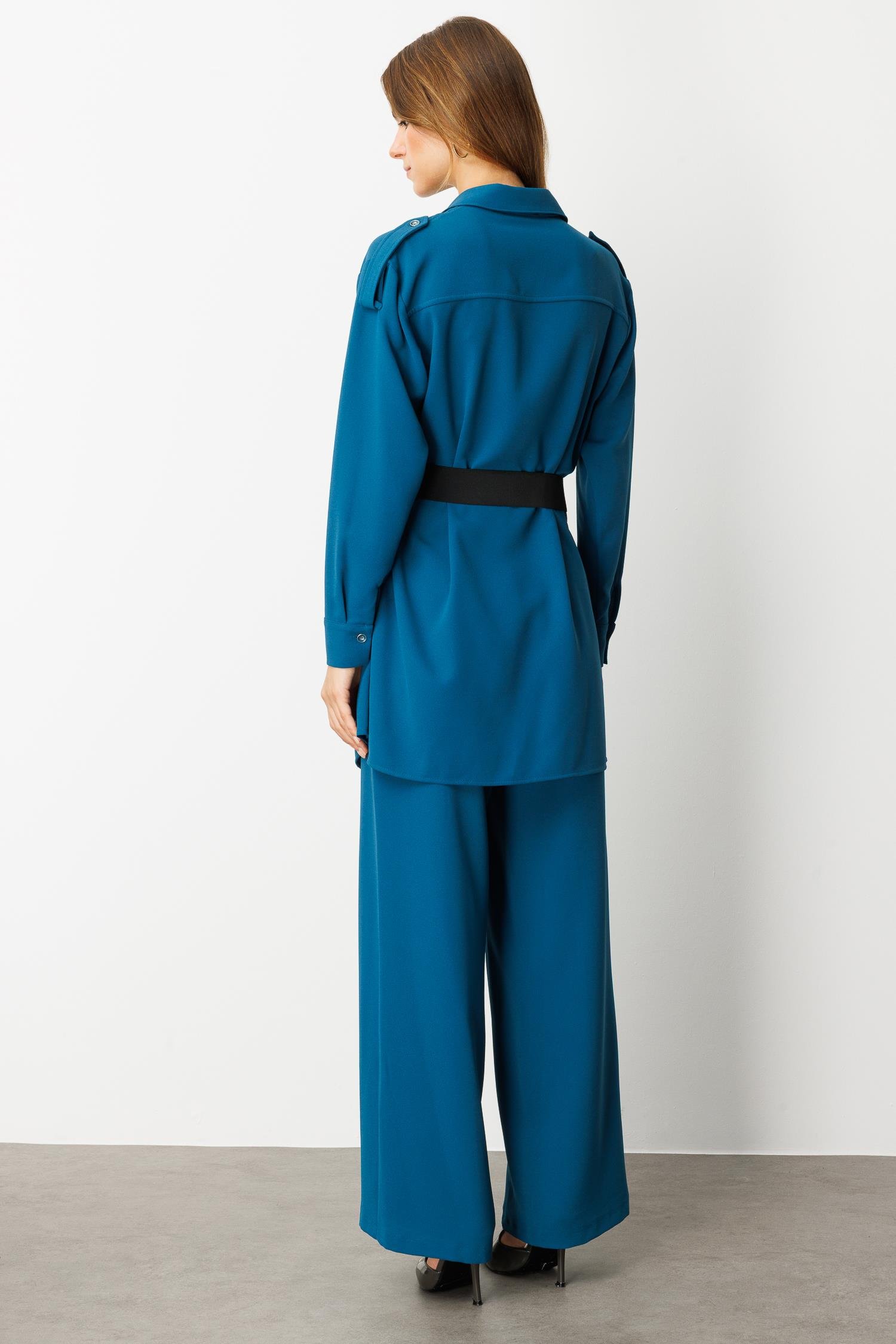 Lastik Kemer Detaylı Krep Tunik Gömlek-PETROL (5WKB81K1973_56)