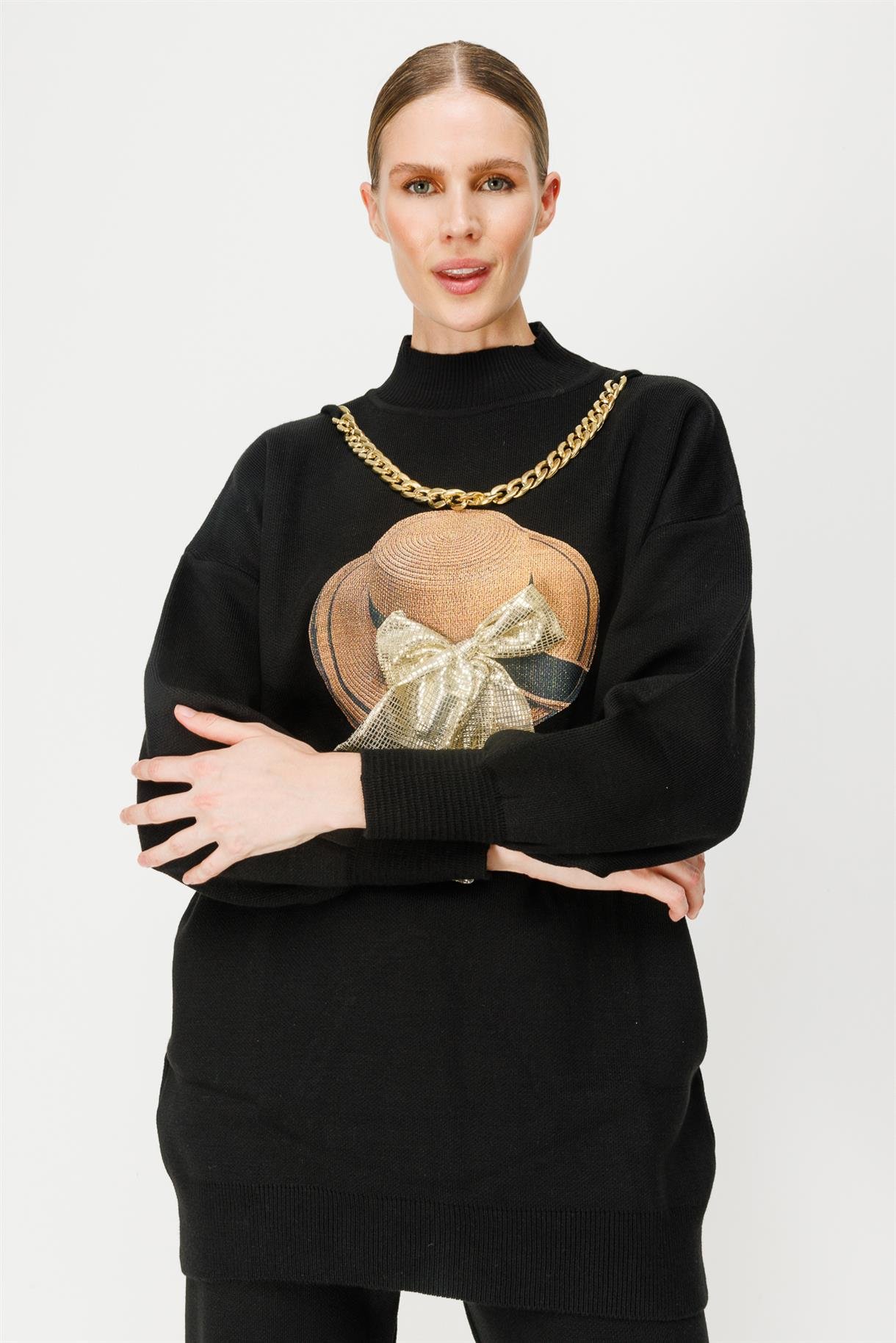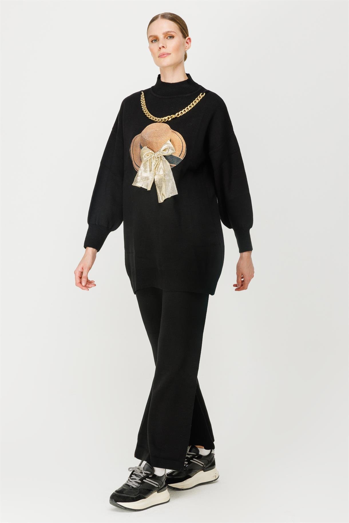 Şapka Figürlü Kolyeli Tunik Pantolon İkili Takım-SİYAH (3WKL0012412_01)