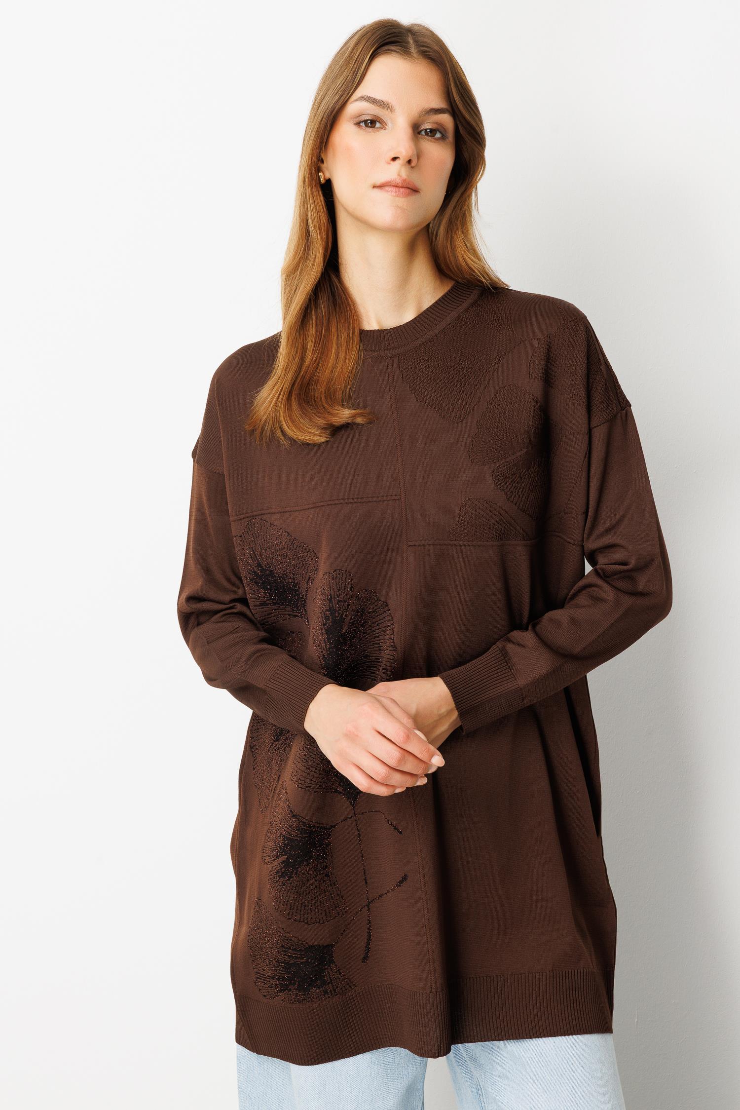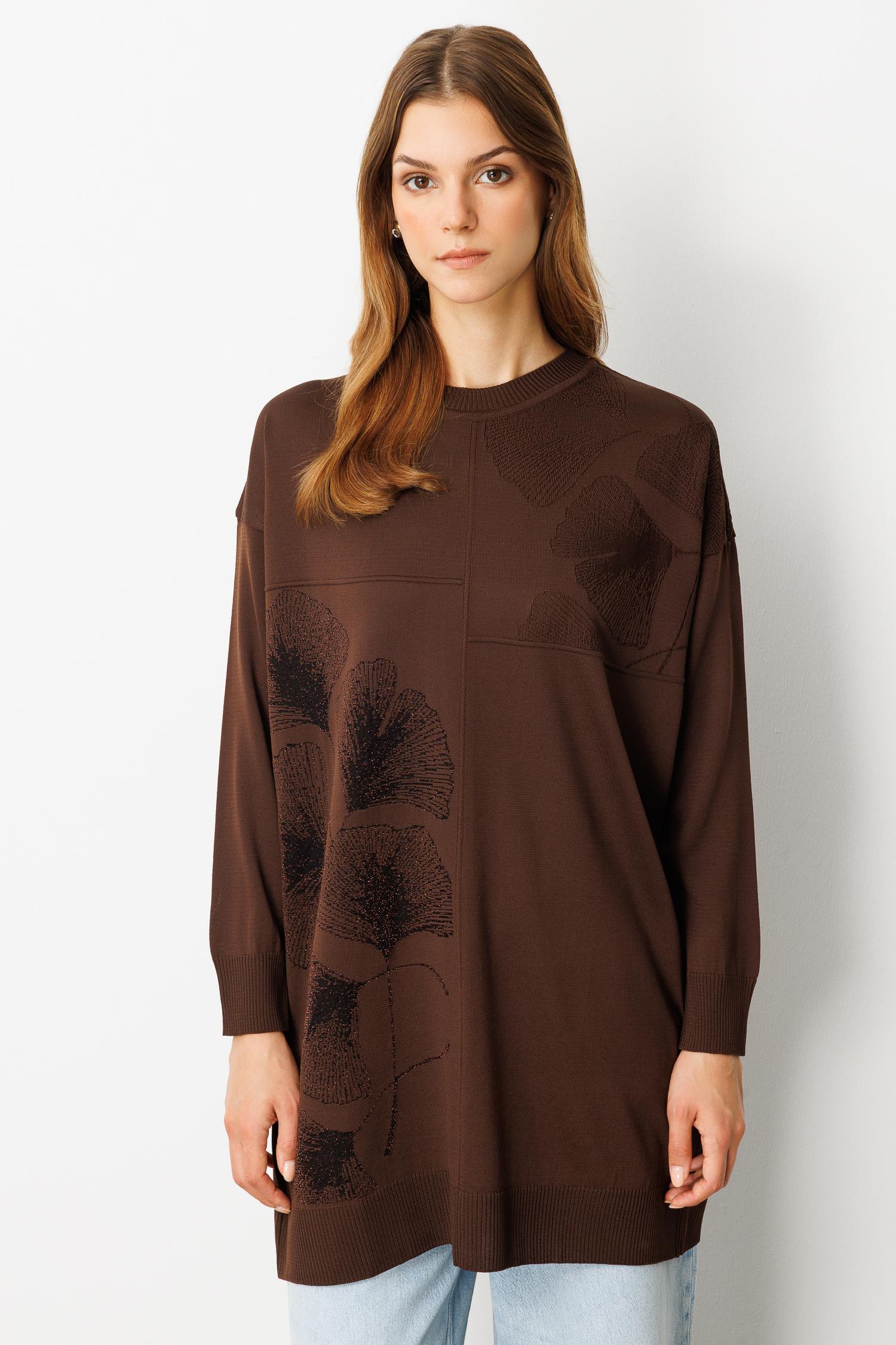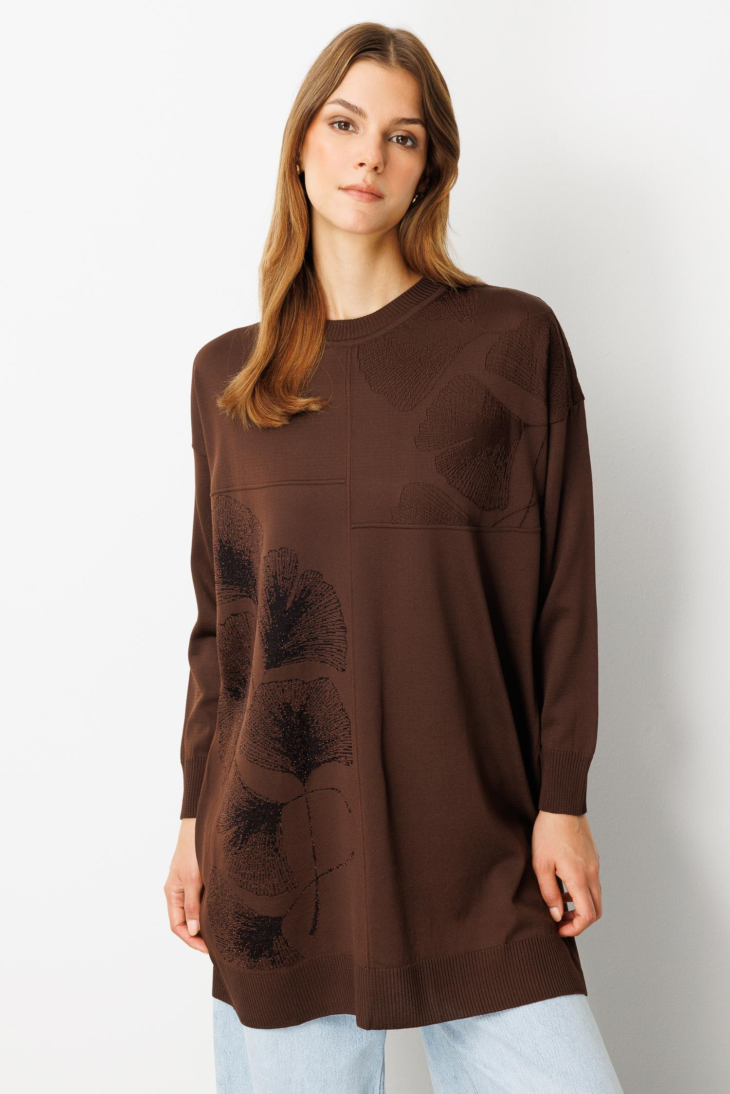 Simli Çiçek Detaylı Triko Tunik-KAHVE (5WT00035261_03)