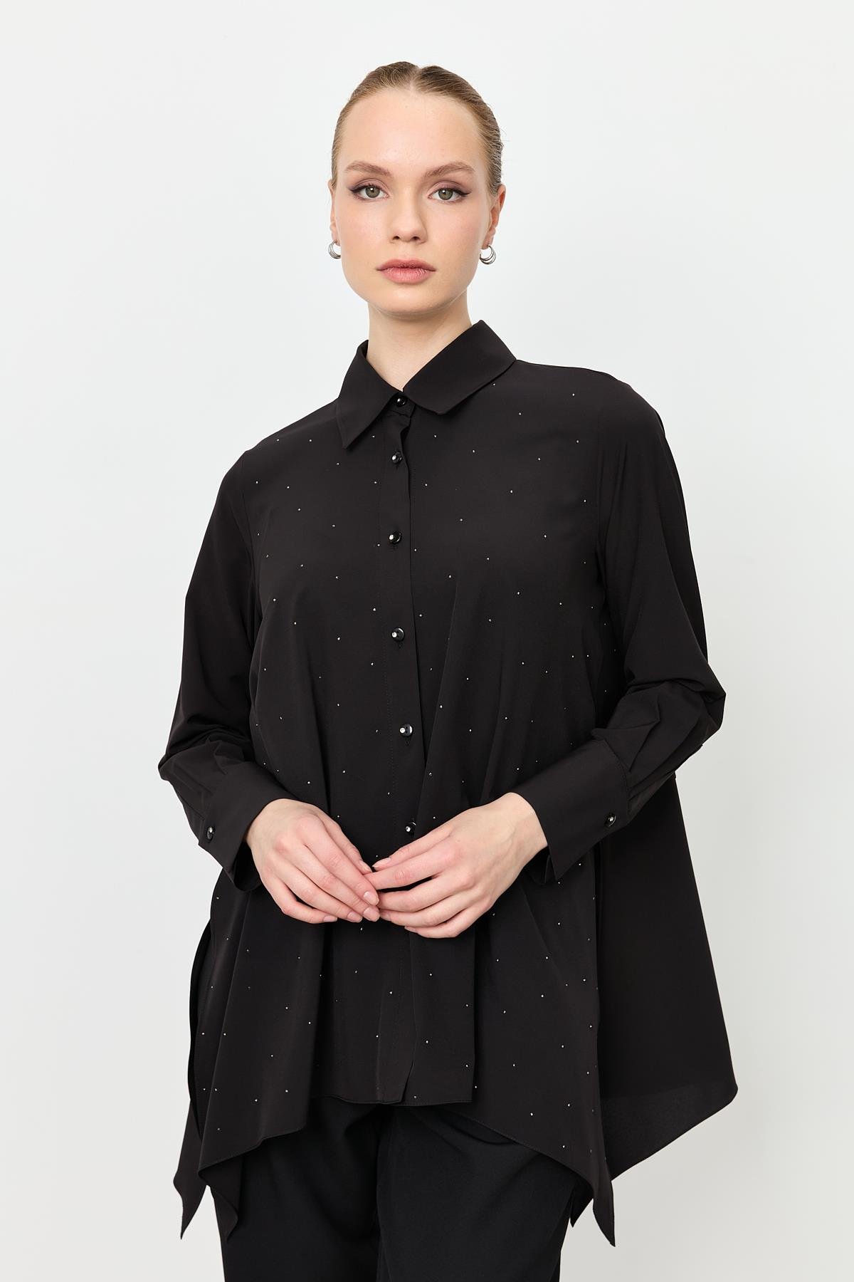 Taş Düğme Asimetrik Kesim Gömlek-SİYAH
