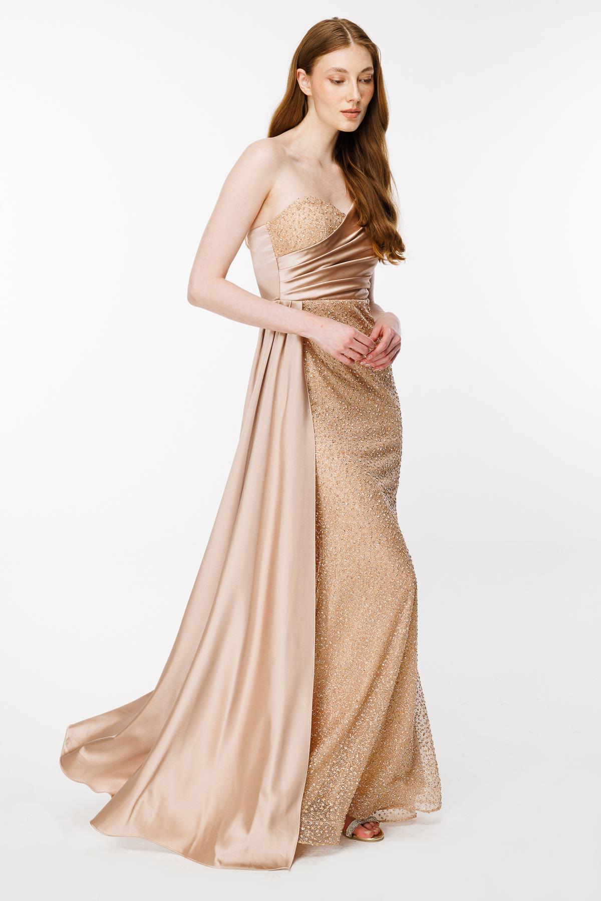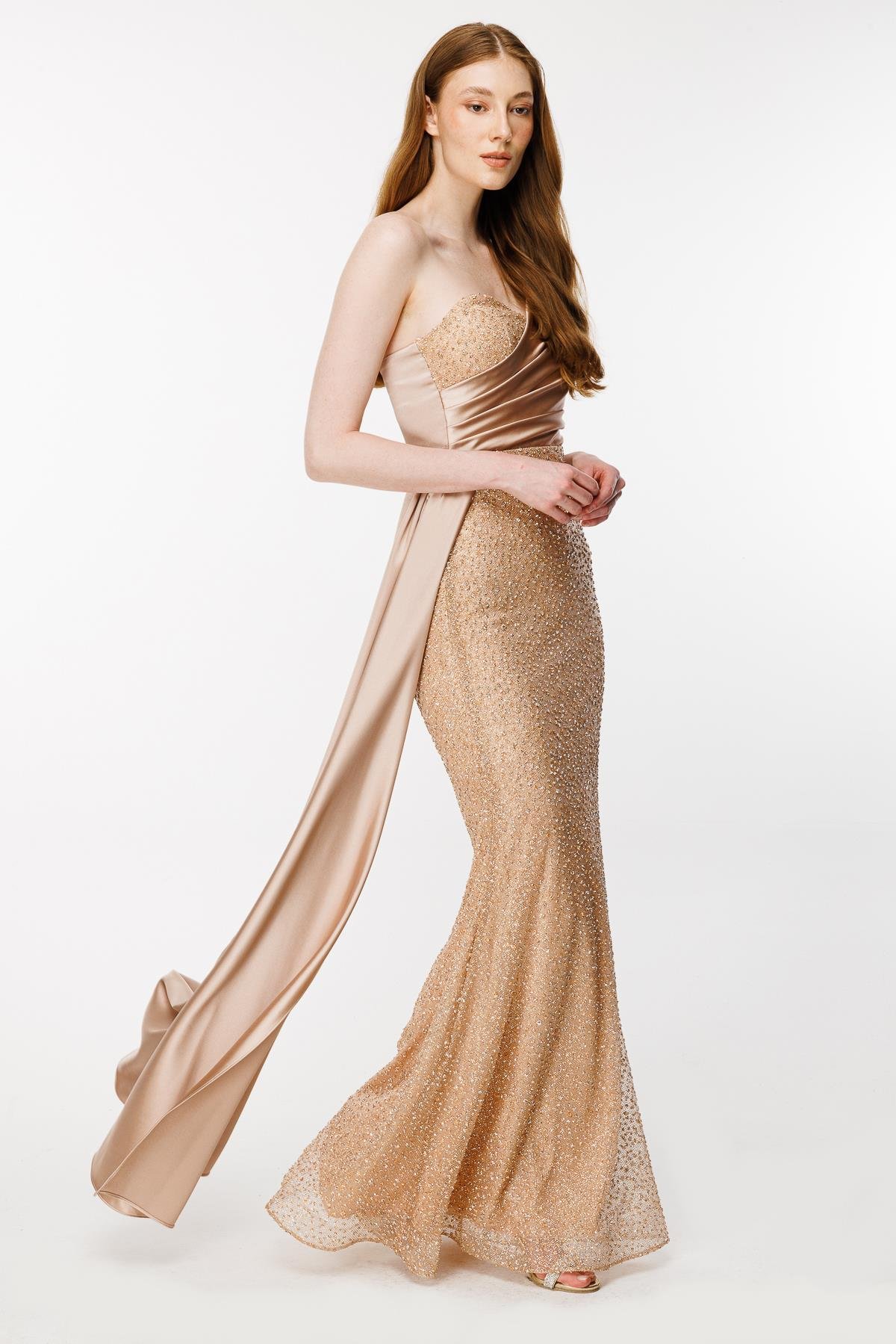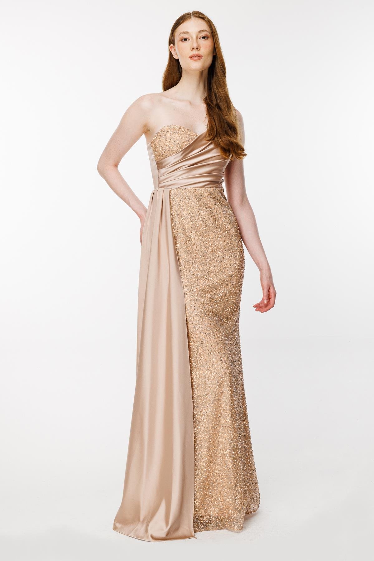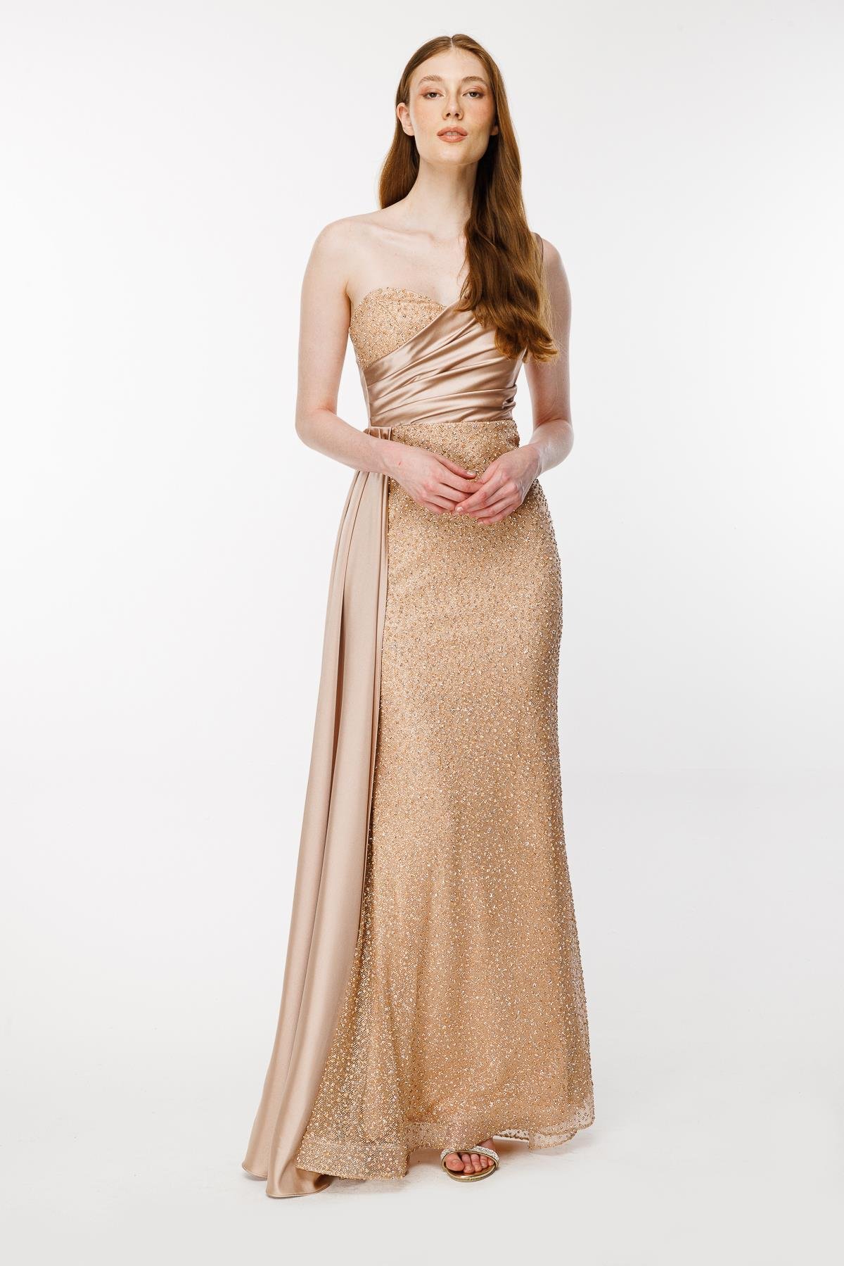 Taş İşlemeli Tek Omuz Uzun Abiye-GOLD (4SRN00K5069_33)