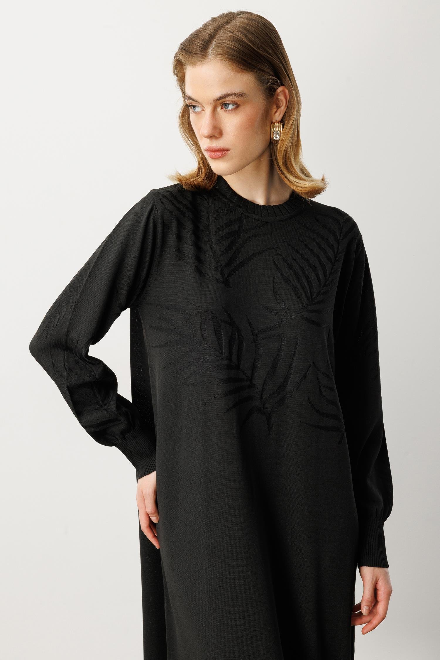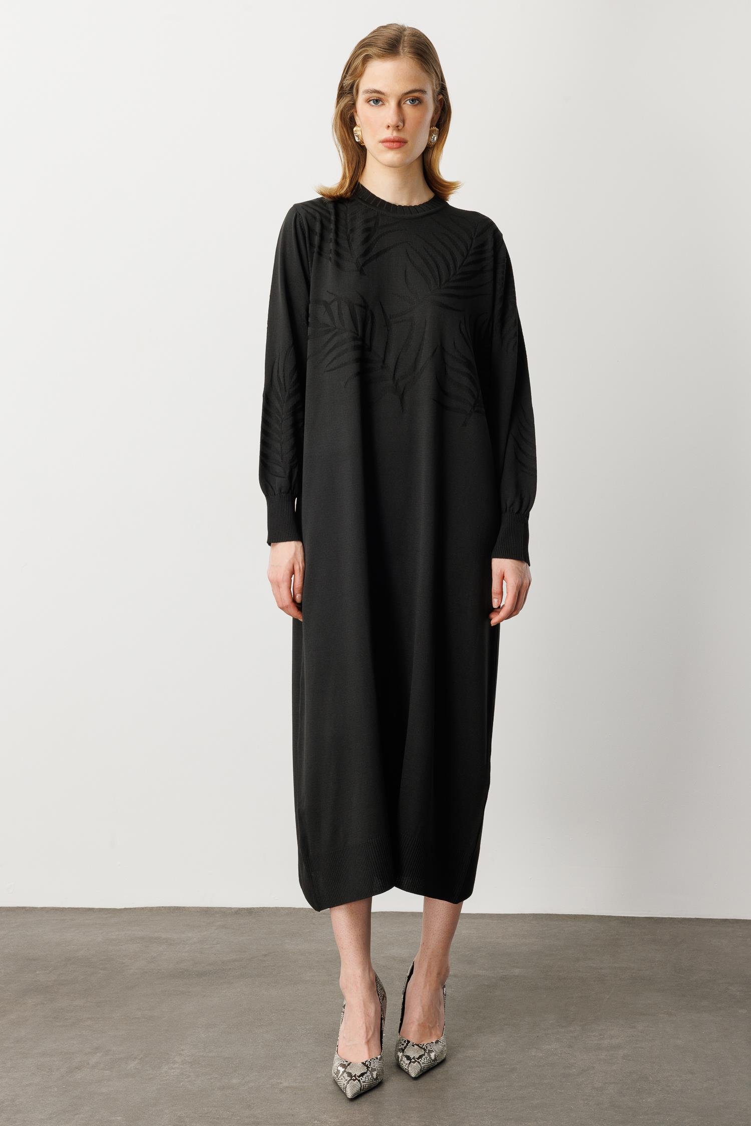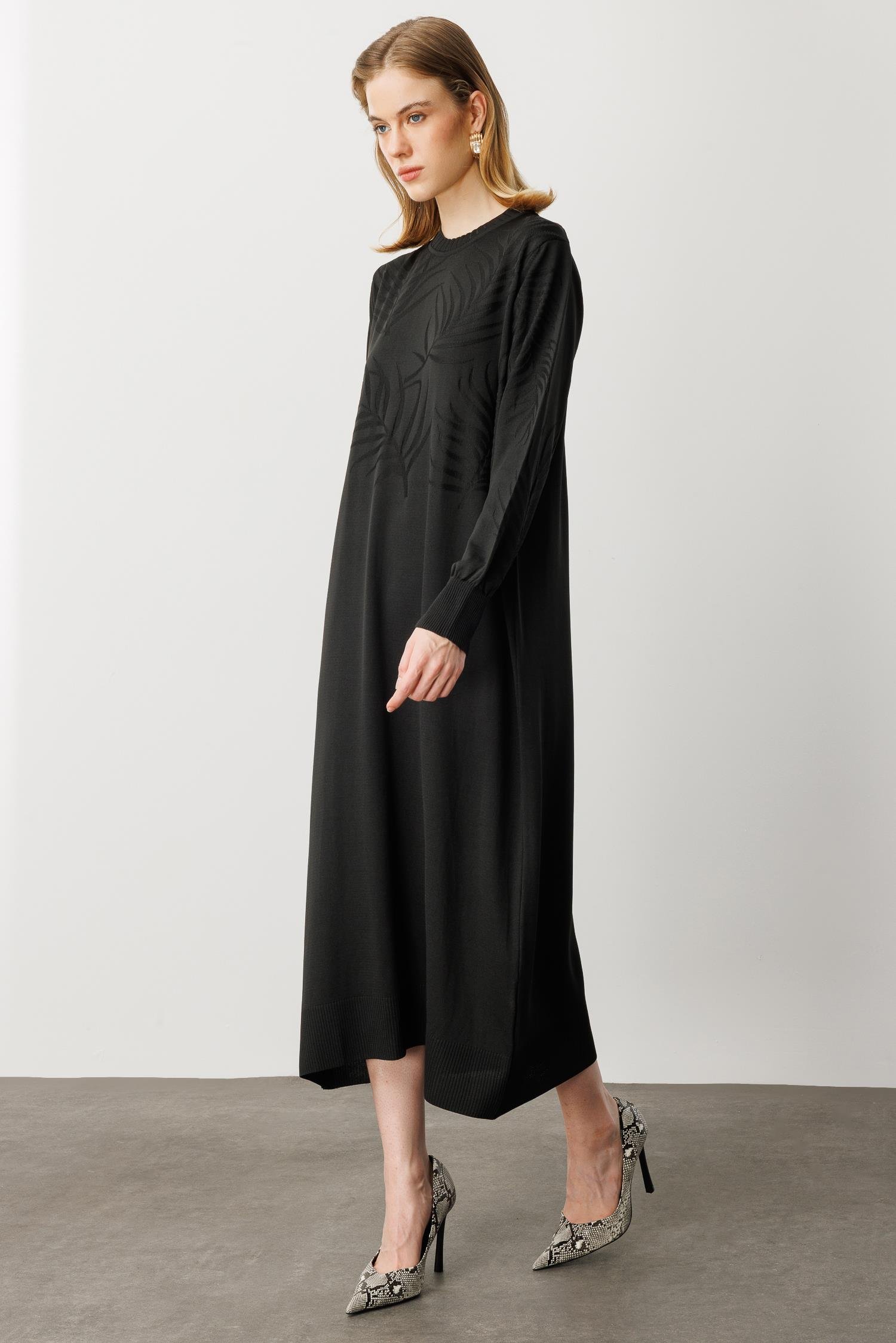 Yaprak Desenli Uzun Triko Elbise-SİYAH (5WT00035258_01)