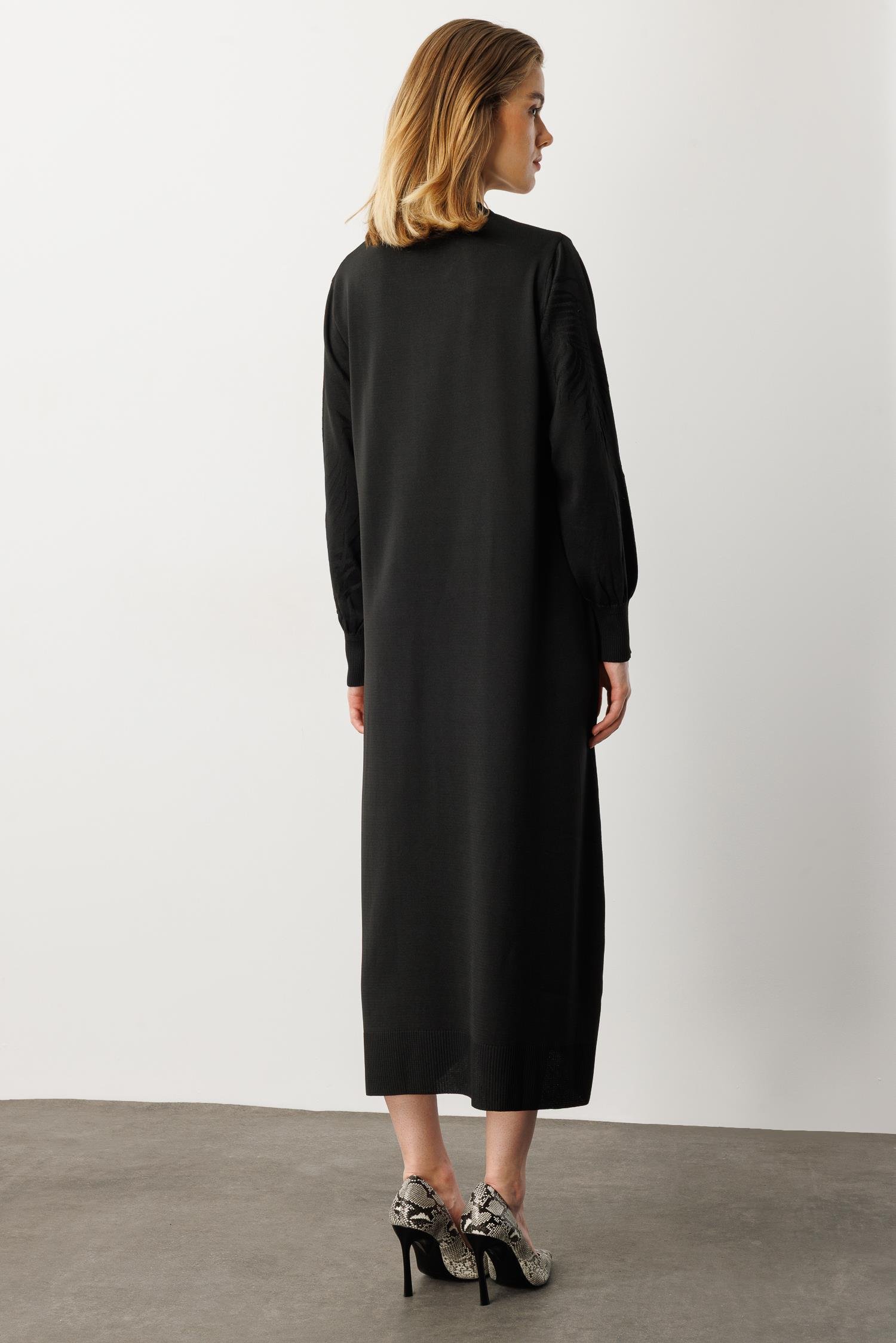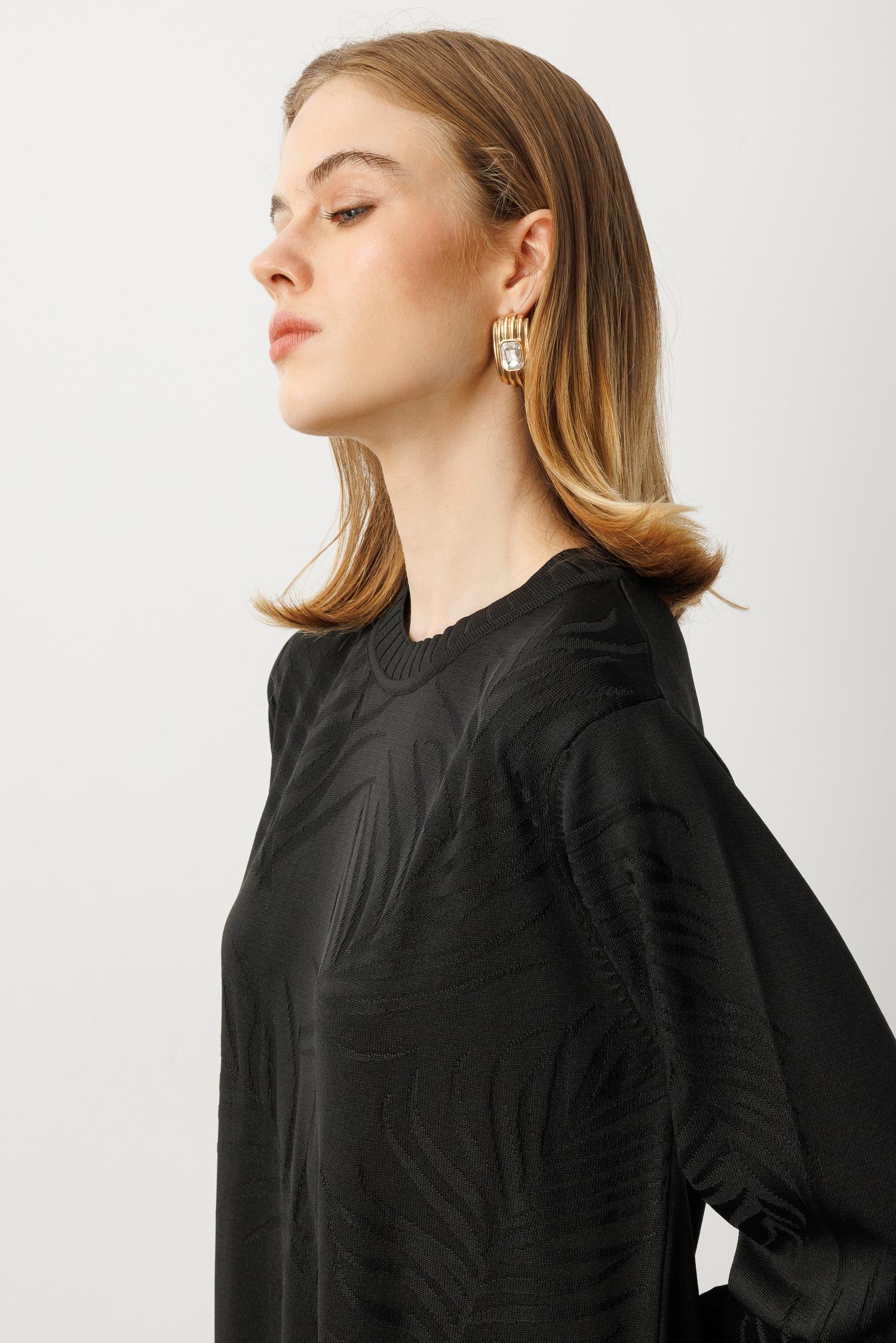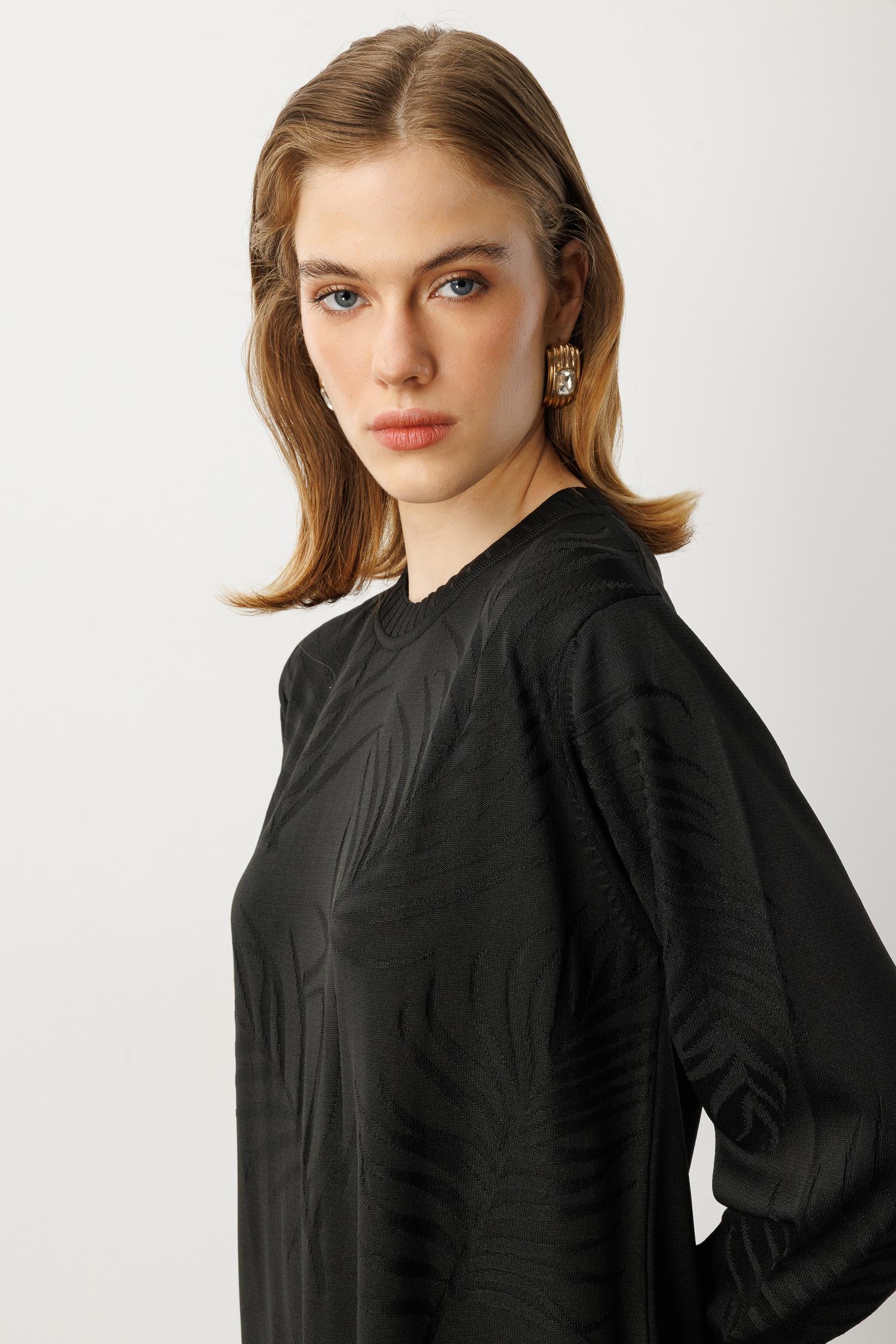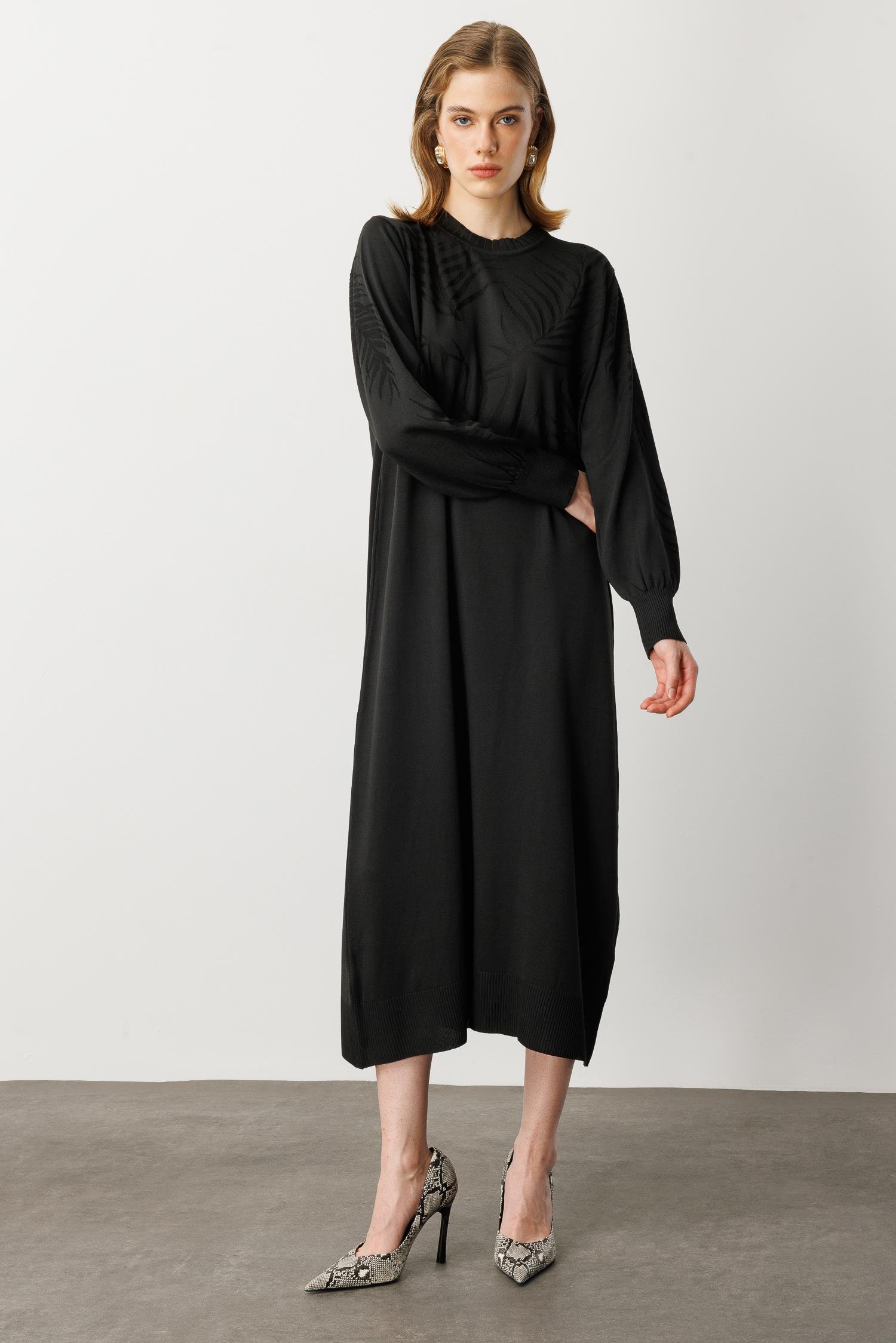 Yaprak Desenli Uzun Triko Elbise-SİYAH (5WT00035258_01)