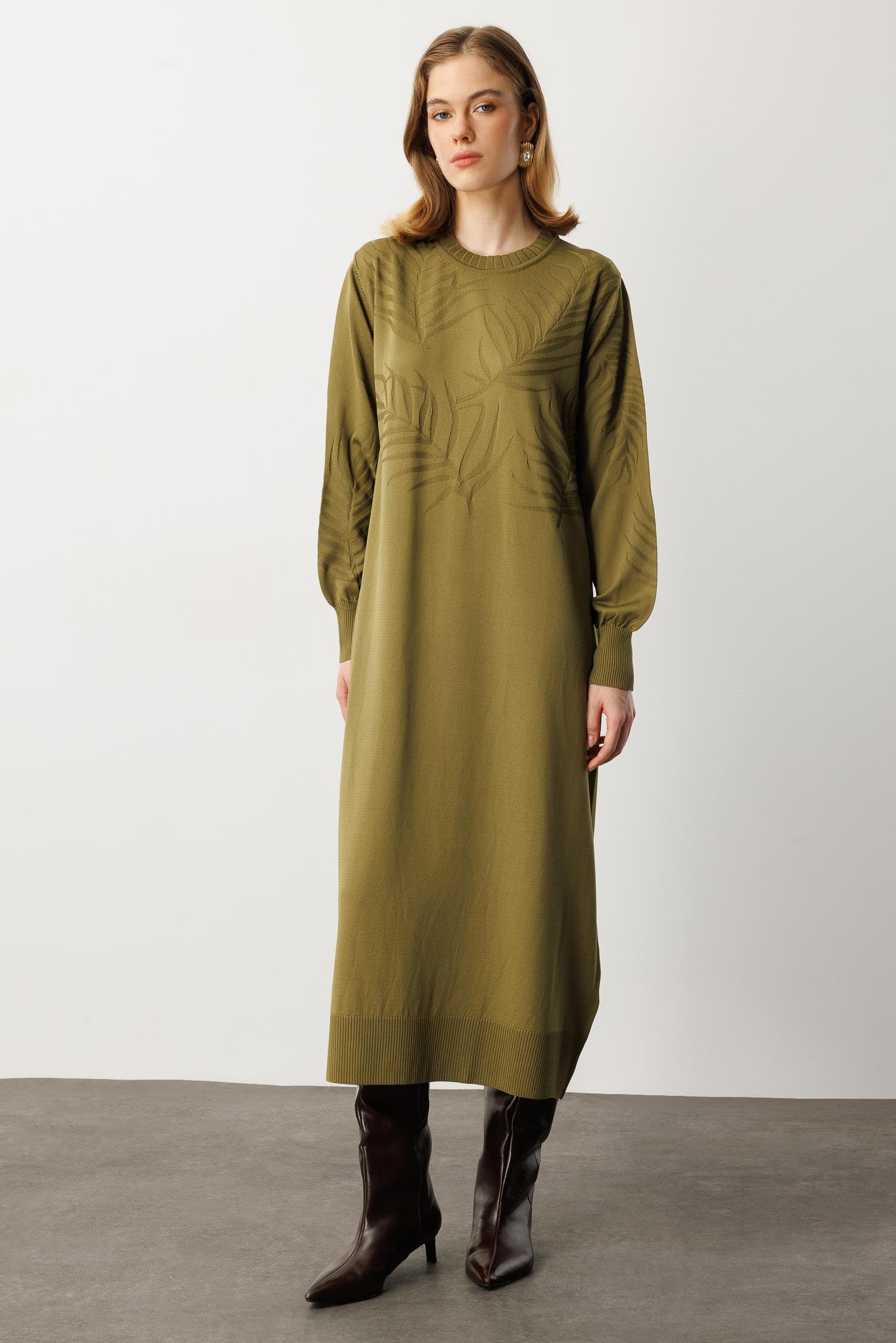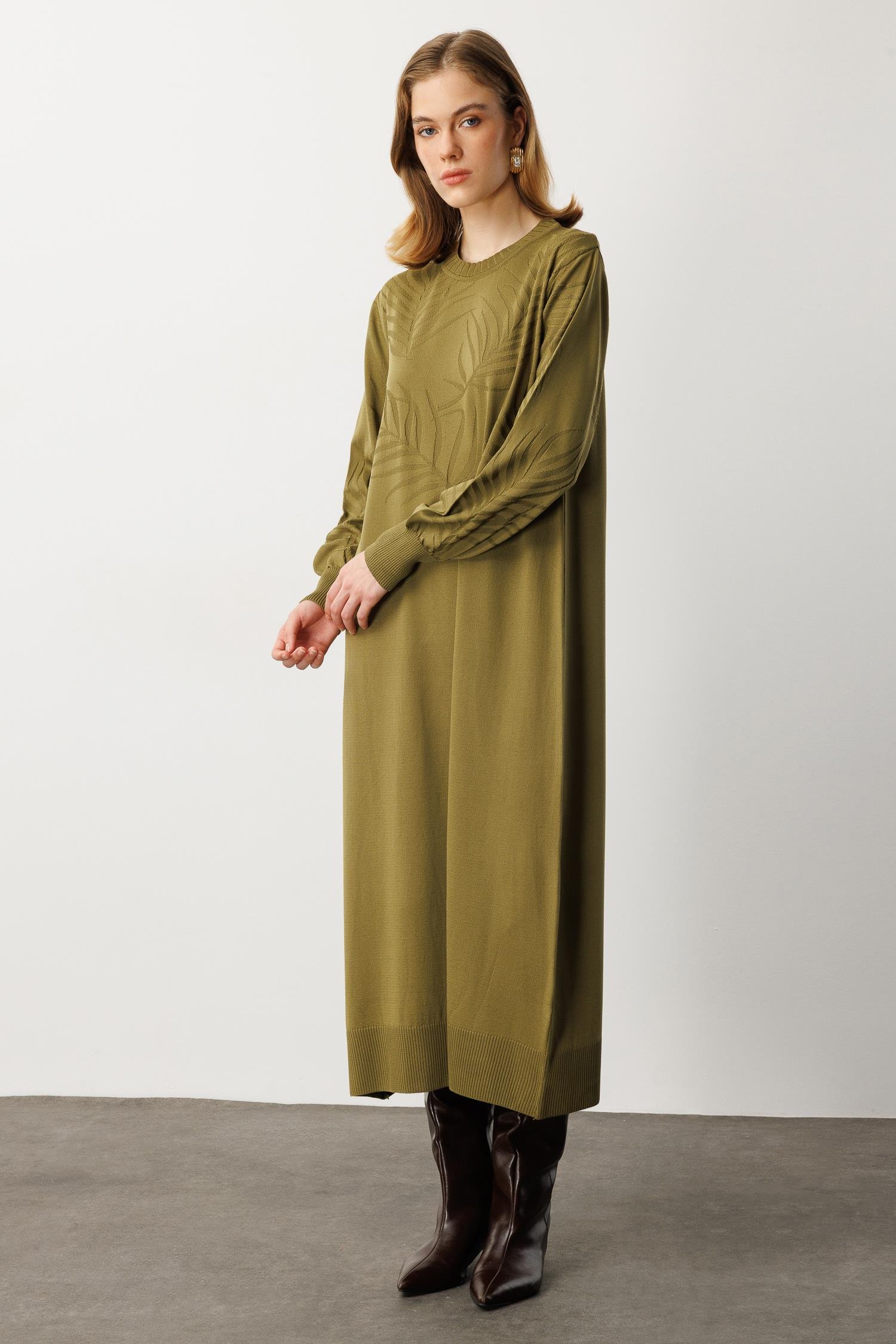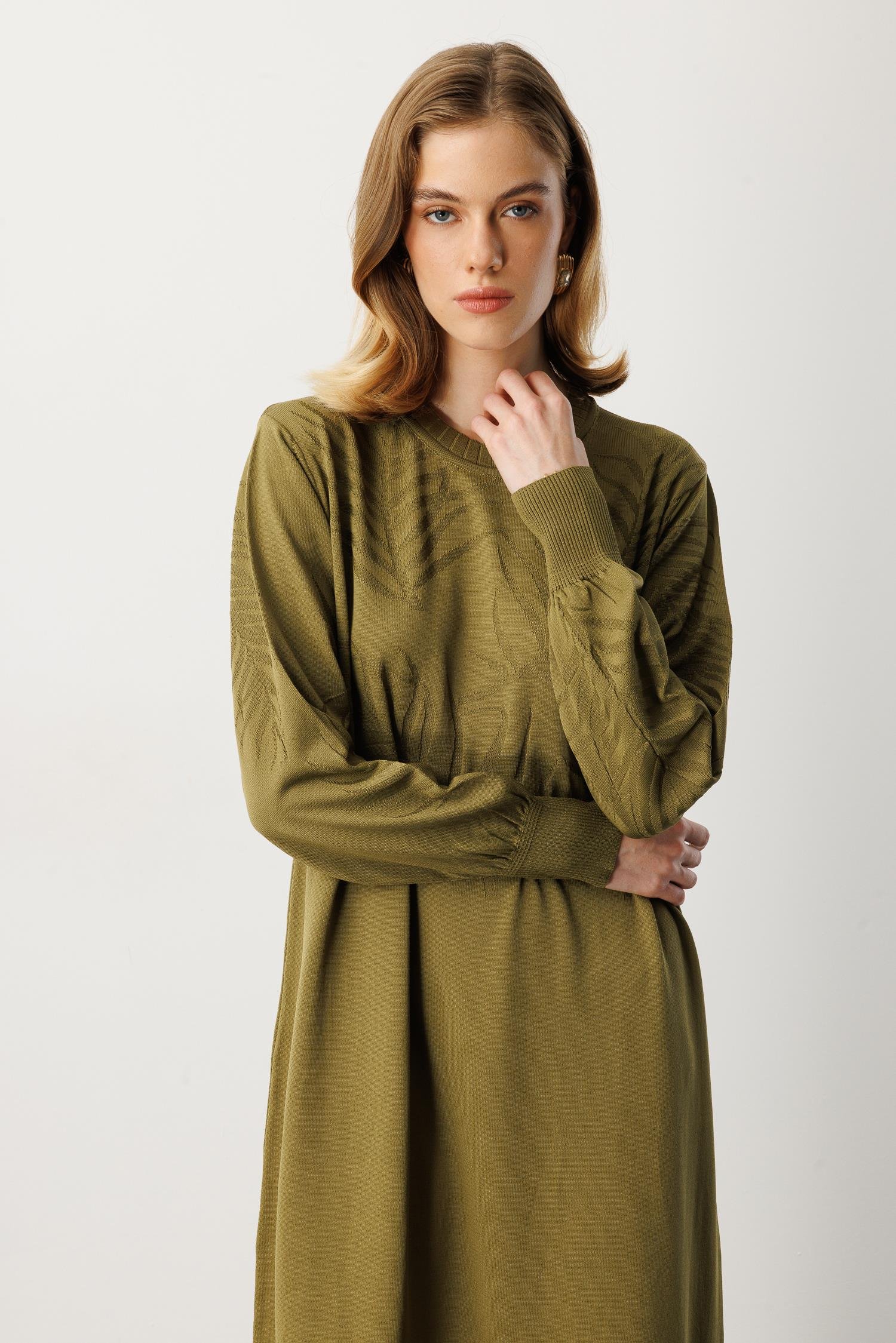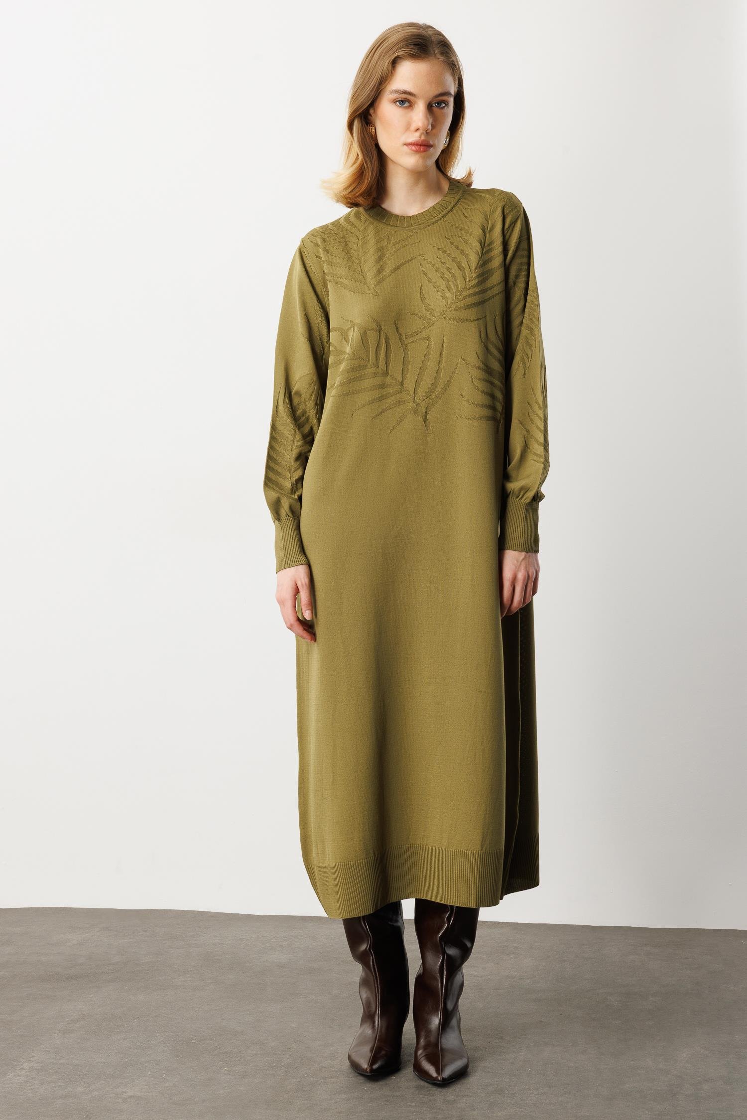 Yaprak Desenli Uzun Triko Elbise-Y.YEŞİLİ (5WT00035258-84)
